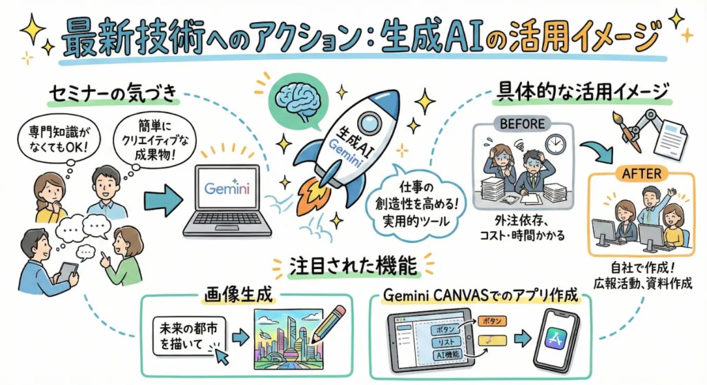 ・注目された機能: 「画像生成」 や「Gemini CANVAS でのアプリ作成」 など、視覚的・創造的な業務への応用が特に注目されました。