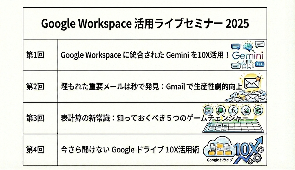 2025年は、Google Workspace の基本と応用、生成AI Gemini の活用など、便利ワザで業務改善を加速するヒントを掴んでいただくことを目的に開催いただきました。