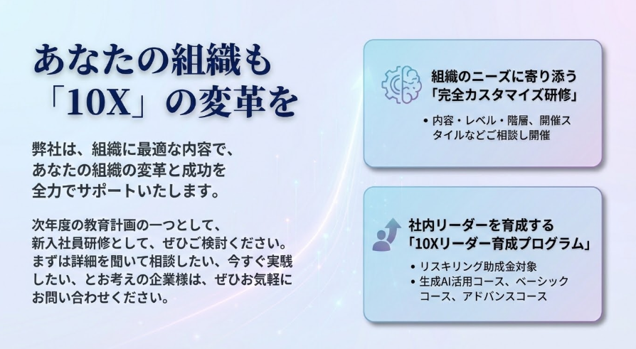 「一度学べばOK」のスキルを身につけた今、それぞれが「10Xの思考」を武器に、組織の壁を越えた連携と変革をさらに加速されることを、心より応援しております。